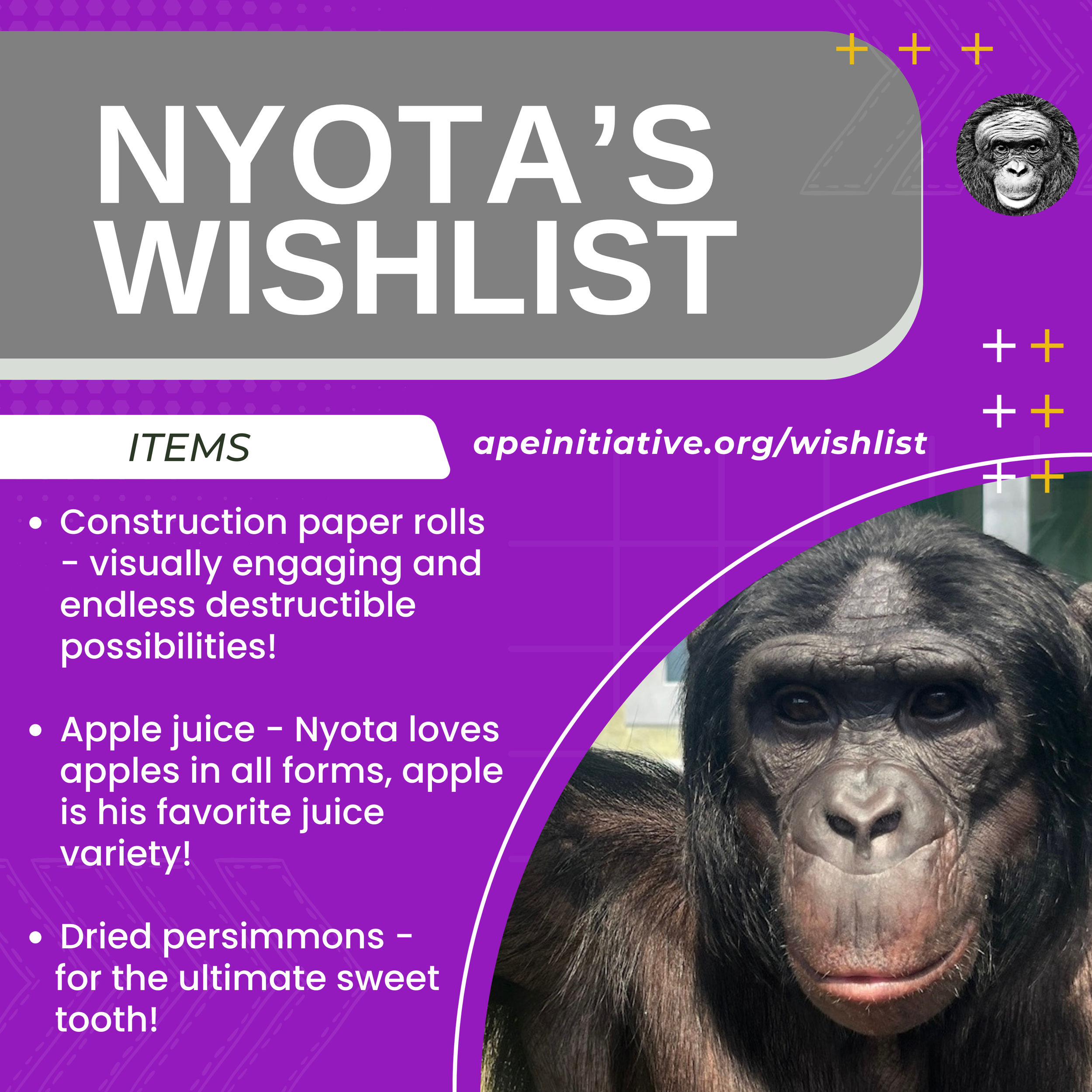 Give the gift of joy to our bonobo family by sending items from the bonobos’ Wishlist! Items include new foraging devices, nesting materials, tasty treats, and environmental enrichments that promote natural bonobo behaviors. Please reach out to our team at info@apeinitiative.org with any questions. Please send any items for the bonobos to the following address: